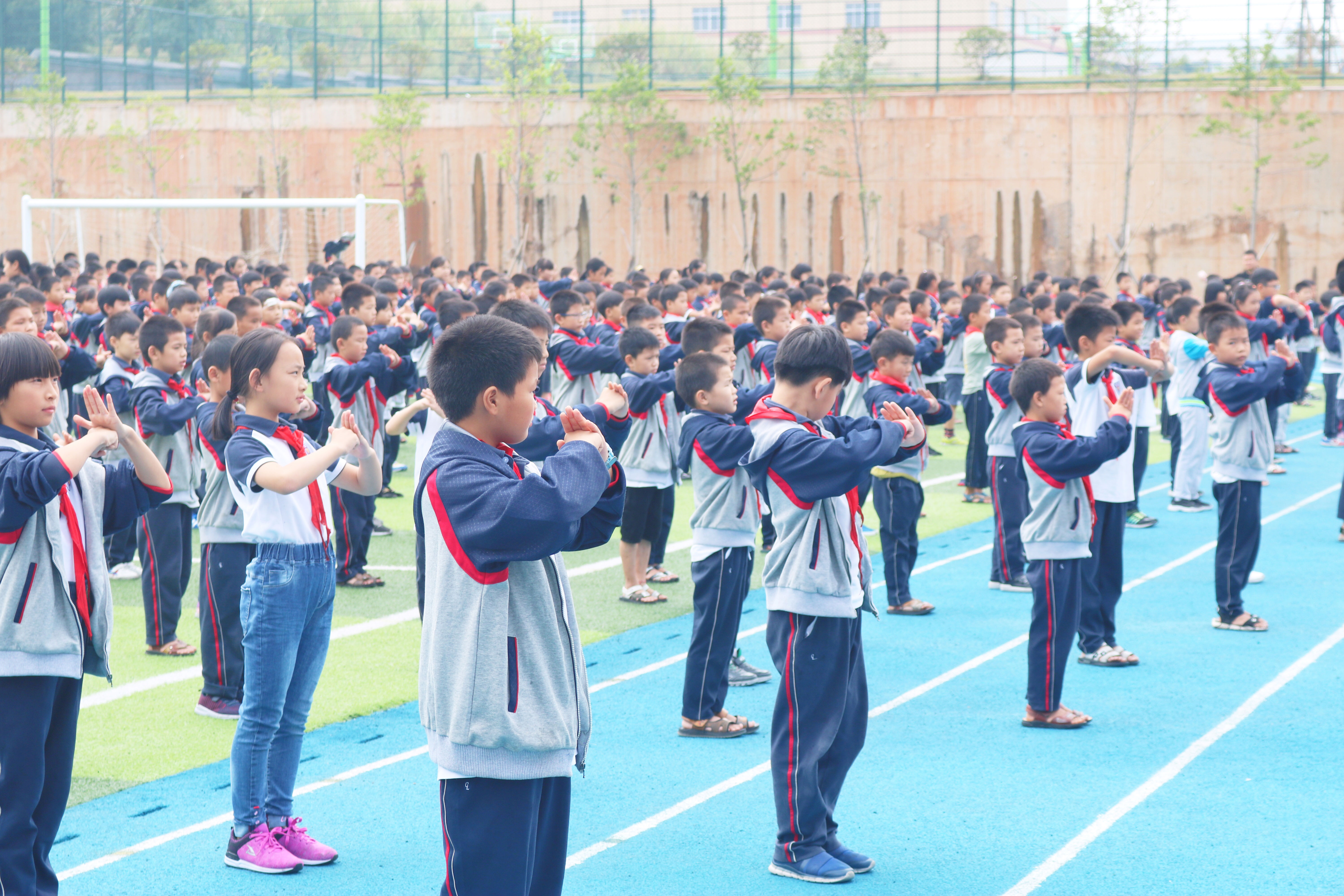 隨著節奏明快,動感十足的《青春修煉手冊》音樂響起,一二年級的孩子們隨音樂節奏歡快地舞起來,擊掌聲響亮清脆,動作韻律動感,時而前進,時而后退,時而跳躍,時而抖肩,將大家帶到一個充滿歡樂,充滿陽光,充滿朝氣的舞蹈世界。百余名學生一起跳,動作優美,一個個面帶笑容,讓人感覺幸福彌漫在整個校園、整個天空。