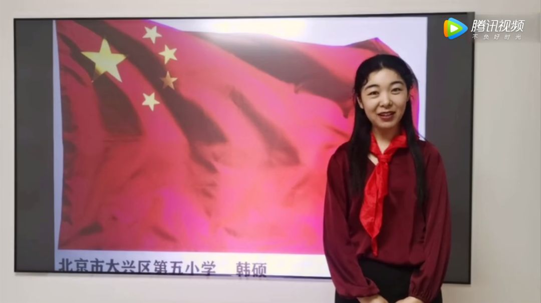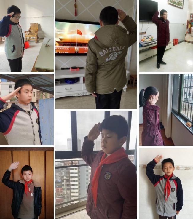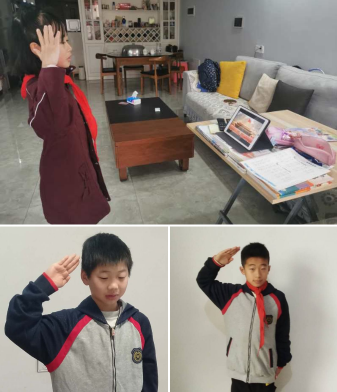 一個個穿戴整齊的同學們,他們胸前佩戴紅領巾在家中面向直播中的國旗肅立,聽指揮高唱國歌,少年隊員敬隊禮。立下凌云志,致敬逆行者,當好接班人。