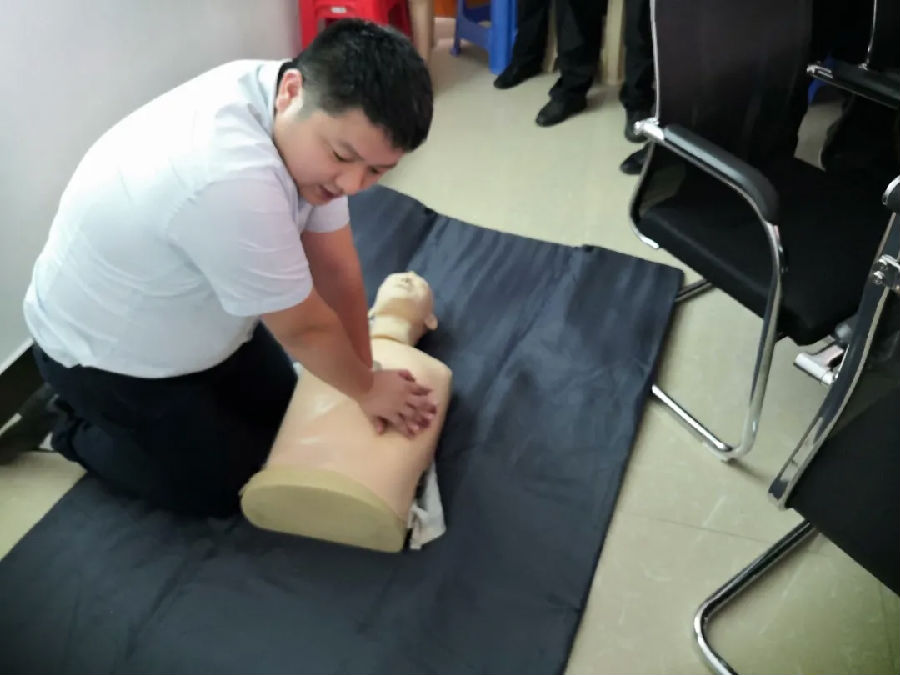 在實操環節,胡洪國主任醫師詳細講解了心肺復蘇的步驟,包括如何判斷呼吸意識、如何進行胸外按壓以及如何開放氣道等。用圖例展示和現場人體模型模擬操作相結合的方式,生動、形象、直觀地對員工講解了心肺復蘇法三個階段九個步驟的基本操作要領,使員工對現場相關的緊急救護常識有了較詳細的了解。