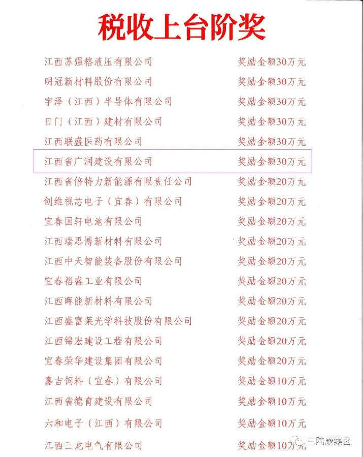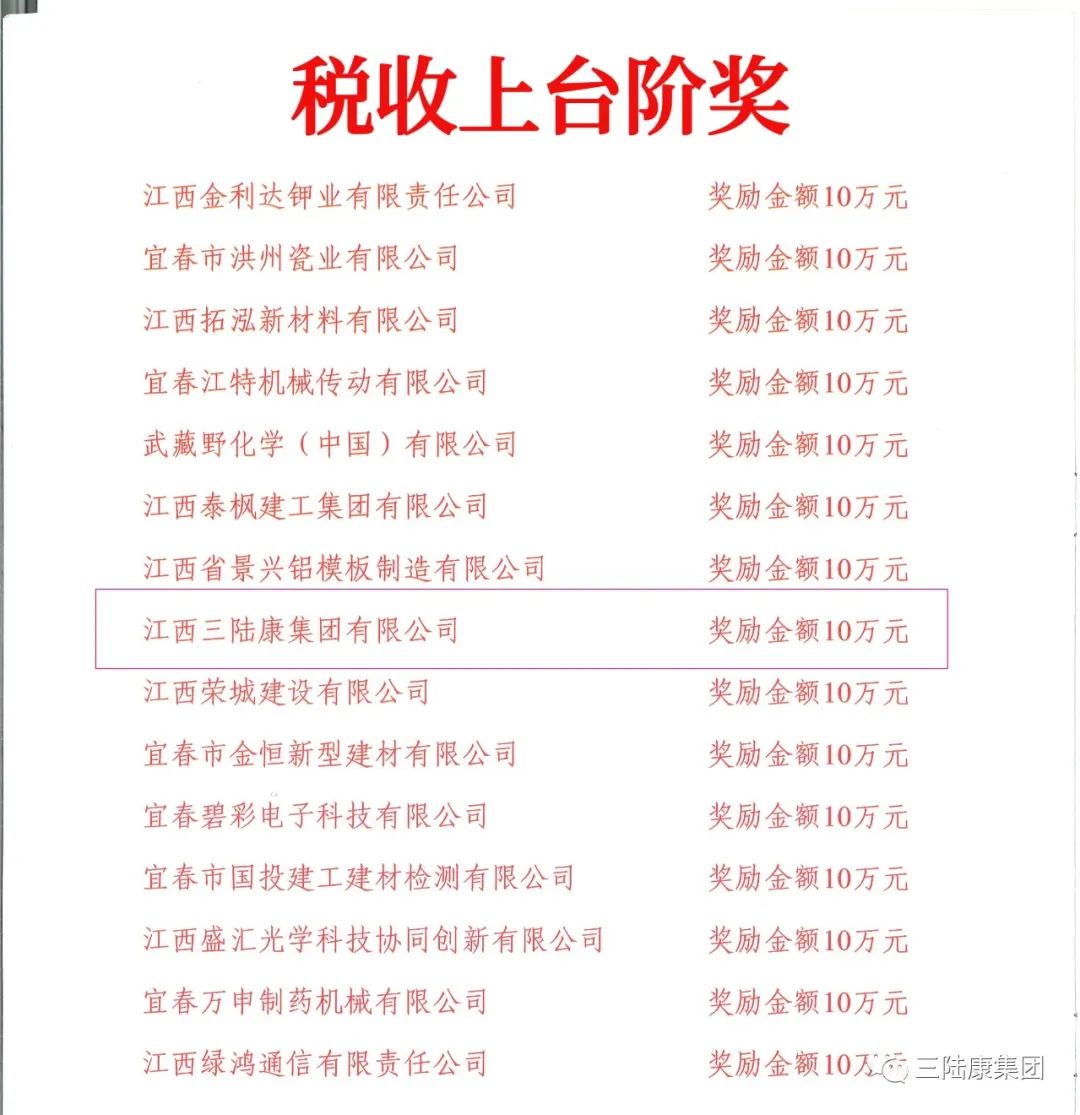江西三陸康集團和江西省廣潤建設有限公司因多年來一直堅持依法經營、誠信納稅,積極履行社會責任,在表彰大會中榮獲稅收上臺階獎,分別獲得十萬元、三十萬元獎金。